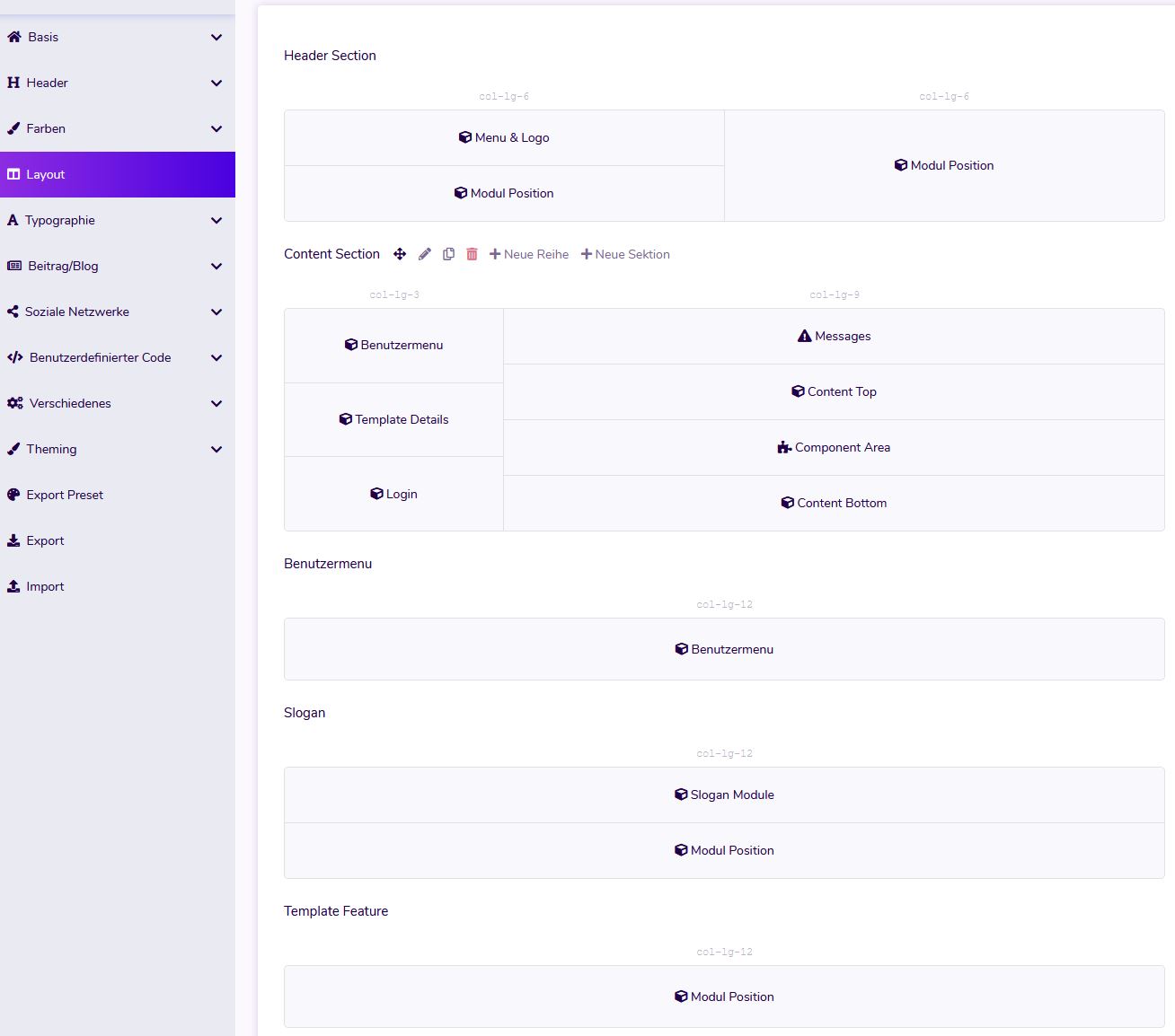Das framework wird mit einem Mega-Menü-Builder per Drag & Drop geliefert. Sie können Ihre Menüpunkte und Joomla-Module hinzufügen und ein interaktives Mega-Menü erstellen.